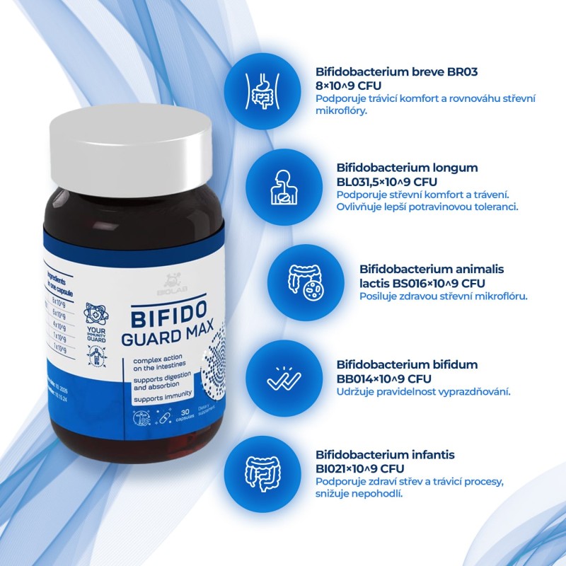 Poznejte Bifido Guard Max - komplexní probiotikum s pěti kmeny Bifidobacterium, které spojuje 20,5×10^9 CFU v jedné kapsli